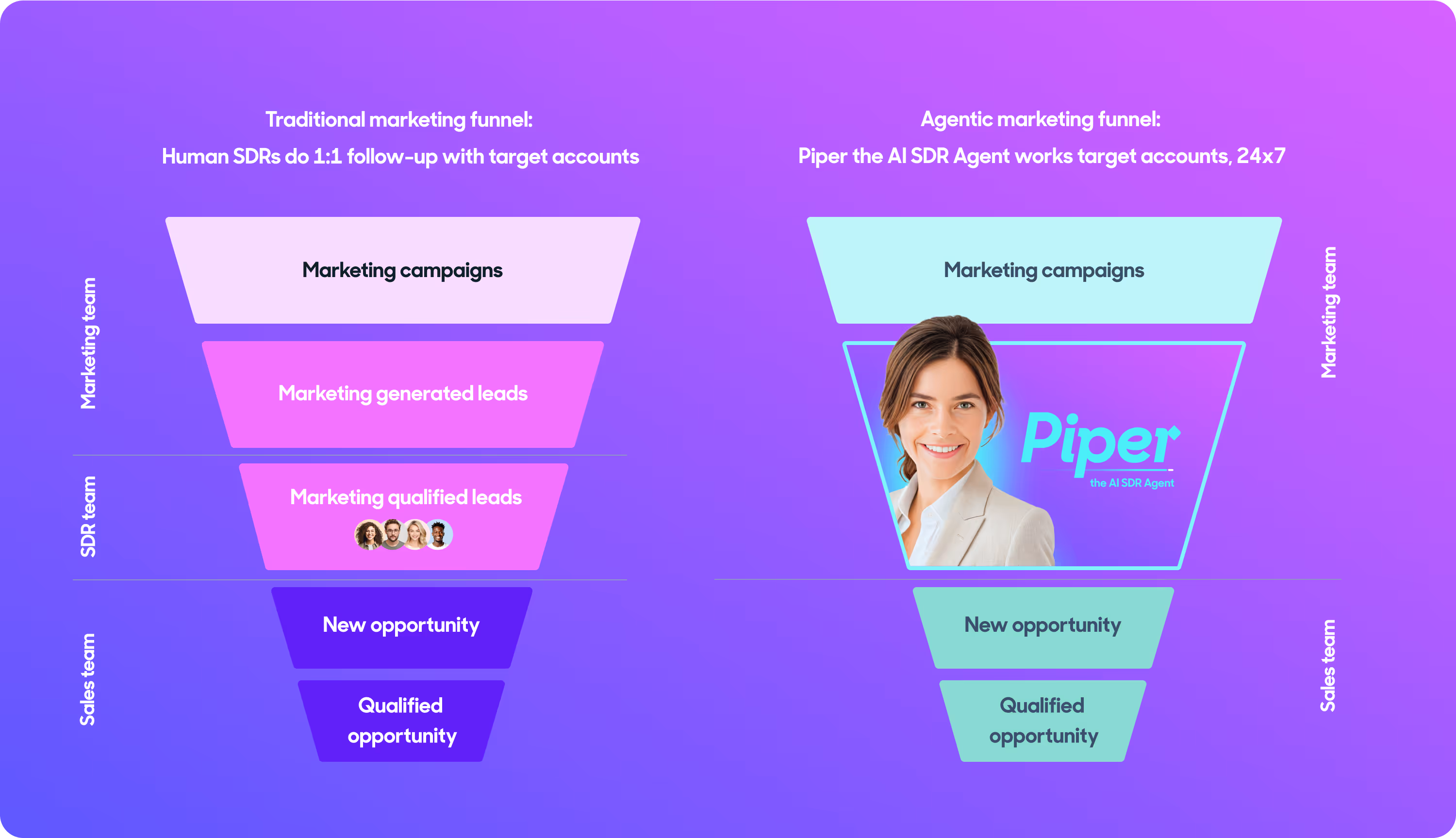 With the traditional marketing funnel, human SDRs have limited capacity and your ICP accounts don’t get the buying experience they deserve. Piper accelerates your account-based marketing (ABM) strategy by engaging and converting target accounts 24x7.