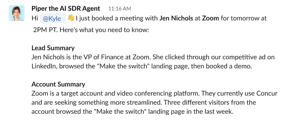 Effective ABM campaigns require intense coordination across teams. With Slack, Piper can collaborate with target account owners to keep them informed of notable events and identify their next best action.